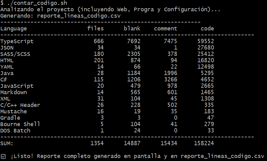 En nuestro análisis más reciente, el script identificó un total de 158,224 líneas de código distribuidas en 1,354 archivos. Notamos una evolución significativa respecto a mediciones anteriores donde dominaba Java; ahora, TypeScript encabeza la lista con casi 60,000 líneas, seguido por un volumen considerable de JSON, SASS y HTML.