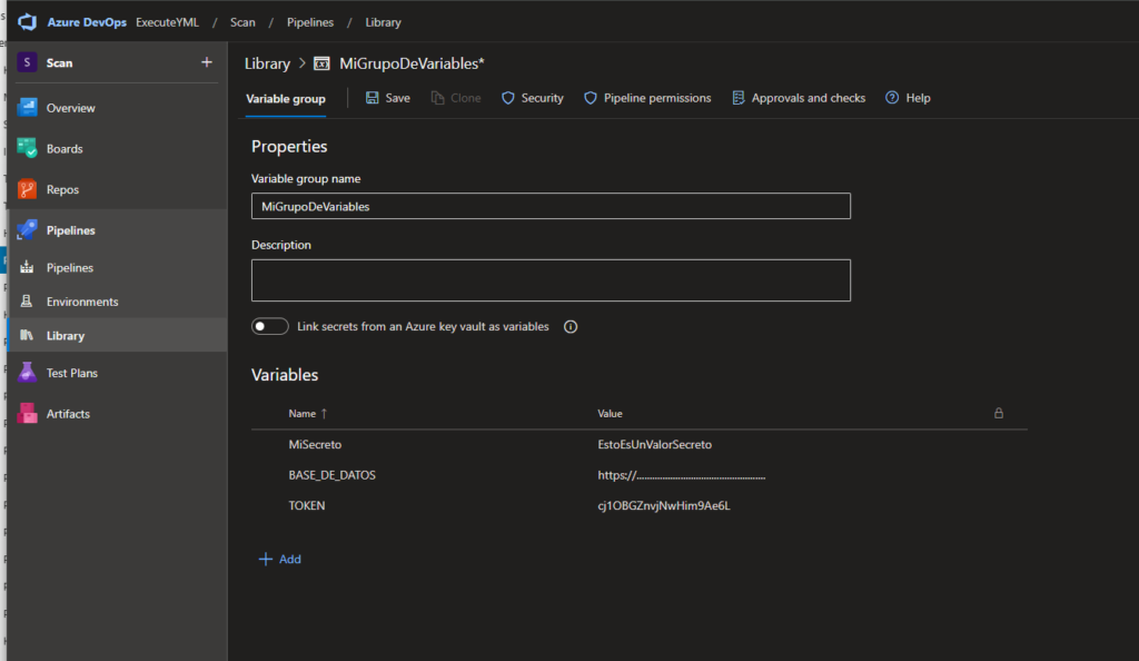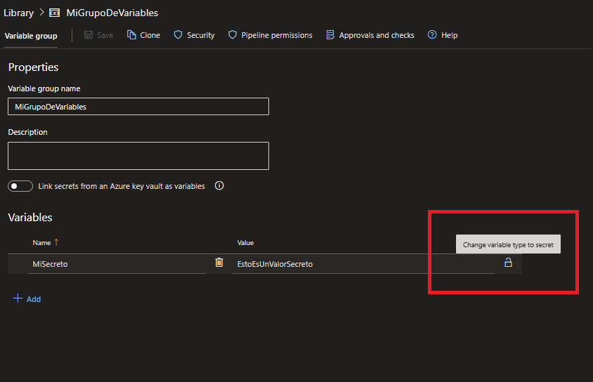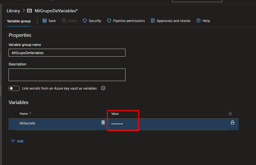 Azure DevOps nos ofrece una forma segura de manejar estos valores críticos. Al crear un grupo de variables, puedes marcar cualquier variable como un secreto. Esto la convierte en un valor encriptado que no se puede ver ni editar directamente después de ser guardado. Incluso en los logs de tu pipeline, el valor aparecerá enmascarado con asteriscos, protegiendo así tu información